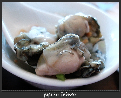 安平虱目魚肚粥,第一次吃虱目魚肚粥,很喜歡這味道,除了魚肚外,還有肥美的蚵仔,有海產粥的味道,但是,食材卻是不同的,這道菜讓我舀了好幾碗入肚呢!