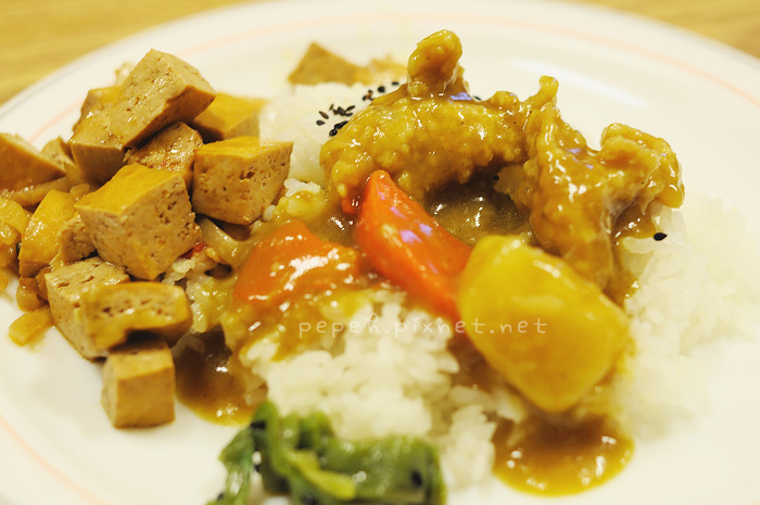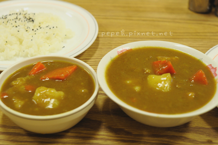 左邊是75元的咖哩雞肉,右邊是100元的咖哩豬肉。