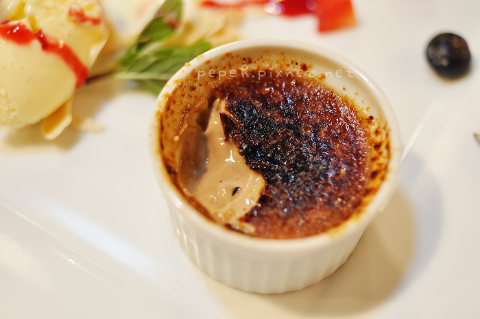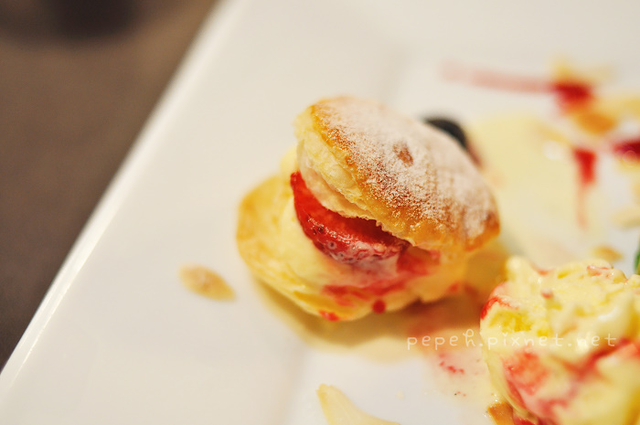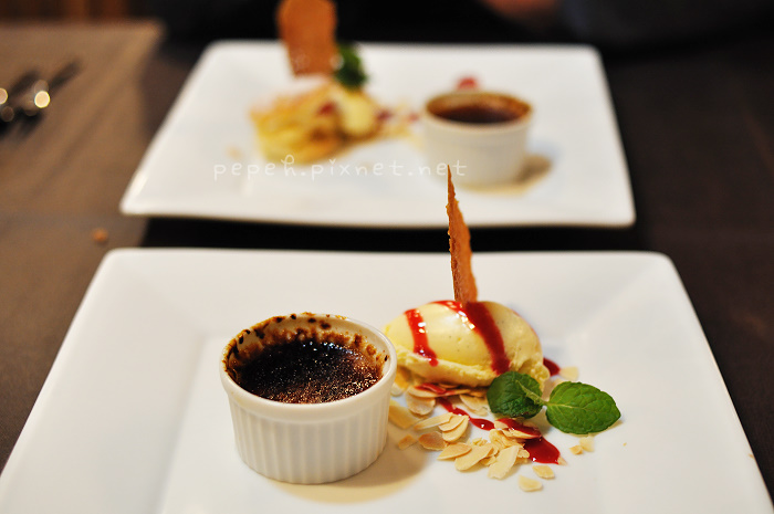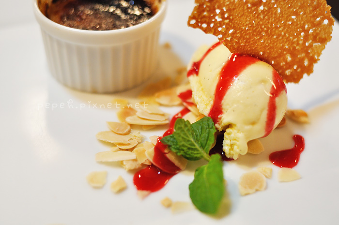 甜點,焦糖布丁、冰淇淋與草莓泡芙。