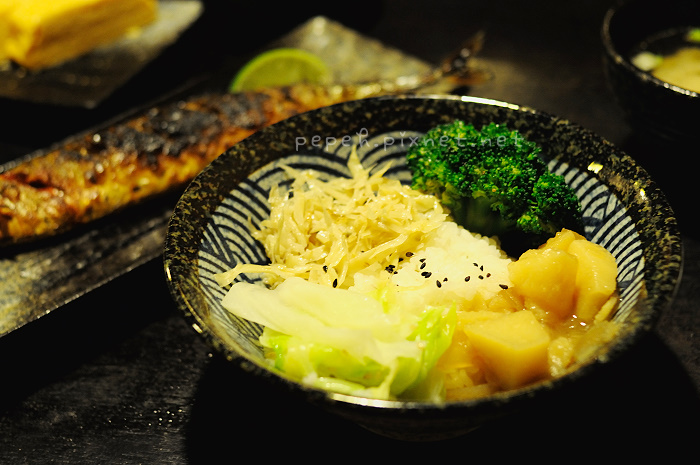 炙烤鮭魚,180元,附飯、菜和味噌湯;我點的是香烤鯖魚,170元,只有主食不同,其他的配菜都一樣。