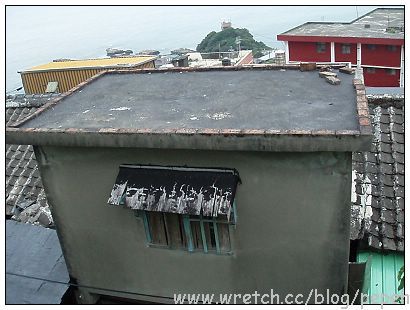 學校附近的住家屋頂是黑屋頂,也就是使用油毛氈,以柏油為黏劑,並用廢棄之輕便鐵軌及鋼索固定的屋頂,湊鼻過去聞,果真聞到一陣陣的柏油味,真是特別。