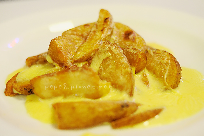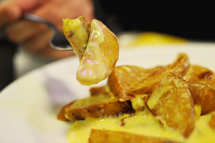 店員推薦自家的手工甜點好吃,但才吃完一頓小晚餐的我們實在無法點太多東西,只好與手工甜點揮手說下次見,各點了一份主食-手工炸肉餅特製蛋包飯與紅酒燉牛肉鬆軟蛋包飯,還點了一份開胃菜-焗烤薯條,焗烤薯條味道很香,自己不甚喜愛焗烤類食物,但這家的焗烤薯條很討人喜歡,也如同分類菜名般,十分開胃,特製蛋包飯的蛋包光滑”閃耀”,金黃色澤又光滑的蛋包真是吸引人,口感也頗為特別,內部的飯為白飯;鬆軟蛋包飯就如同一般常見蛋包飯的外皮,包的是蕃茄醬炒飯,手工炸肉餅是豬肉做成的,外皮很酥,豬絞肉味道也好,包了起士一起炸,醬汁選的是肉桂咖哩,附餐飲料選的是紅茶與雪碧,紅茶本身就甜,店員建議得要加些冰塊才不會那麼甜,吃美式料理喜歡配可樂,但那天沒可樂,選了雪碧,不是一杯上桌,而是一瓶,喝起來也暢快,這晚吃到的餐點味道都很好,列於下次再訪的名單中~^^