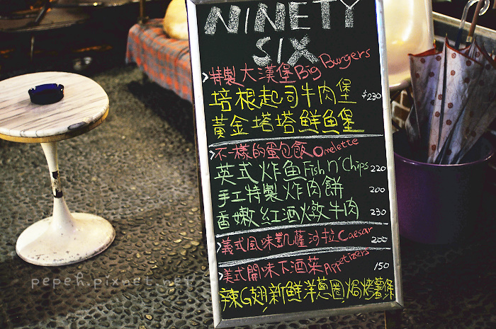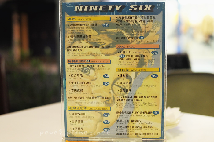 那晚吃完櫻樹下的關東煮後,雖然有點飽意,但仍不太滿足,當下決定往前去另外一家林大哥推薦的店,第二頓晚餐在NINETY SIX得到滿足,看到這家餐廳的菜單後很訝異,與花蓮的幹道肉餅菜單很像,也有肉餅,也有一些美式料理,店裡的裝潢與擺設佈置也有點相似,因店內不能拍照,就沒拍店裡的樣子了,幸好餐點可拍照,可以讓我們帶些NINETY SIX的記憶回來。