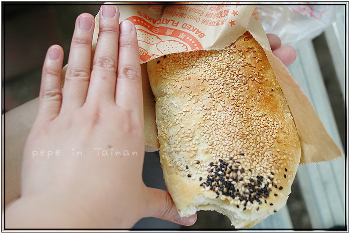 純甜燒餅,20元,約比手掌略長一些,我的手掌較一般的女生大,約16~17公分長,由此可知這燒餅有多大,