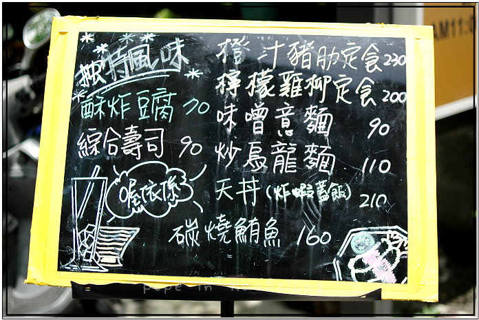 翻開菜單,決定點兩份定食,再加點一份雞肉串燒,定食價格不算貴,這一餐吃下來470元,就一般日本料理店而言,這一餐應該算便宜了,其實,坐下來沒多久,就跟w說了悄悄話,這家日本料理店的生意好像不是很好,周末假日快12點還沒有客人進來用餐。沒想到,語畢,客人就像是約定好的一般,陸續上門,放眼望去,原本空蕩蕩的室內空間,頓時人聲吵雜,生意真好!