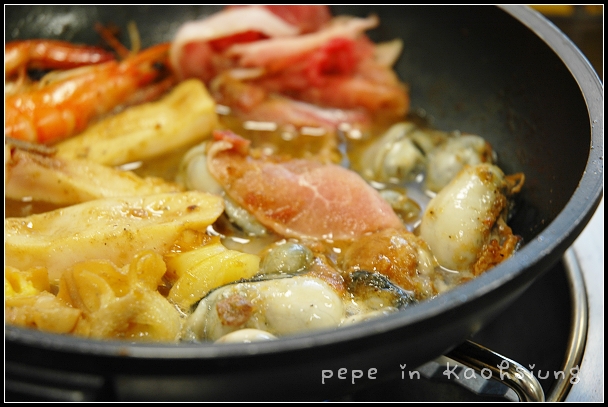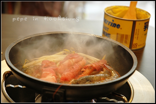 ●燒肉,用奶油為底,再放上肉片’蝦子一起燒烤,味道真是好極了。