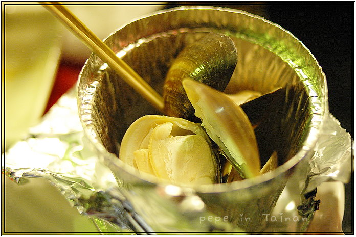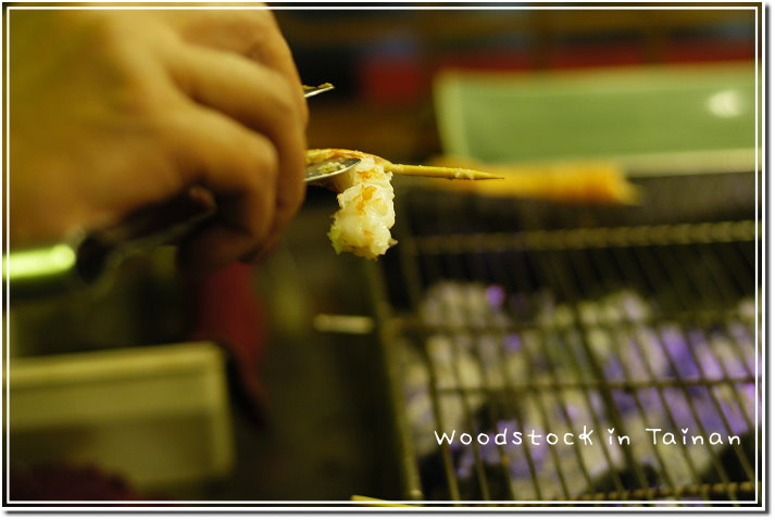 烤蝦子,不是單純的烤蝦、翻面、上桌,老闆還會幫蝦子”整形”,讓蝦頭的肉集中,讓客人方便食用,烤好後,老闆會詢問你是否要將蝦身和蝦頭分離,方便客人剝蝦。愛吃蝦的人一定知道,剝蝦頭最怕滾燙湯汁噴到身上,老闆已將頭身分離,就較好食用,加上些許胡椒讓烤草蝦更有味道,不管是蝦頭或蝦肉都非常美味,幸虧今天只有我們一桌客人,老闆看我辛苦的剝蝦,決定助我一臂之力,用小夾子快速幫我剝蝦,簡直如庖丁解牛的神技…可是這項服務若逢客人多就沒有了,真是謝謝貼心的老闆…^^