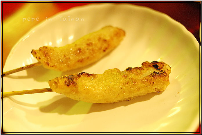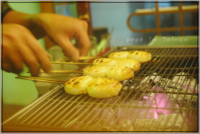 我們的第一道菜,就是從烤麻糬開始,這是w念念不忘的菜色,需要不停翻面,怕麻糬烤焦是重點所在,最厲害之處在於老闆自製調配的醬汁,嚐不出來是用那些調味料調配,吃起來微鹹帶甜,口感則是外酥,裡面的麻糬軟,卻又不會黏牙,獨特又好吃的味道真令人難忘。