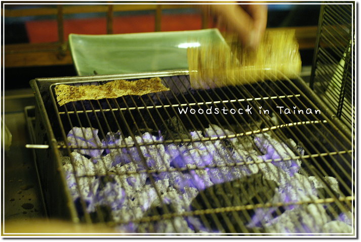 烤魚片(tatami-iwashi),老闆介紹這道菜色是總是用日文發音,不太確定中文如何翻,只好暫以烤魚片代替,類似吻仔魚的魚片,經過燒烤後,顏色和花紋都像家中的的”榻榻米 TATAMI”…這是非常麻煩的一道料理,把很多隻小小魚構成的魚片放到烤盤上烤,要用手不停快速翻動,是的,是用手!簡直是搏命! 因為用夾子跟不上翻面的速度,深怕一個不小心就烤焦了,技術性很高的一道料理…此外,這道要用手拿取食用,若用叉子吃,老闆說是對這道料理的不尊敬~(笑)