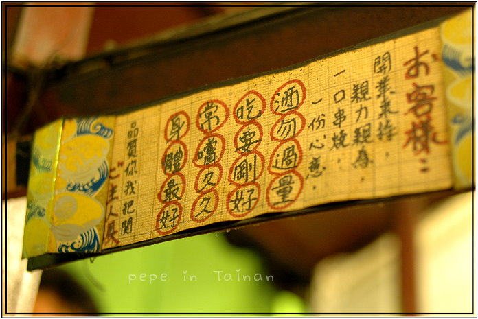 坐在攤位前,看著老闆專心燒烤的模樣,隨時解說食材的特色,不必擔心店內佔多數的日文字,老闆會一一講解,還會教我們怎麼唸,如果不是老闆說中文,還以為自己身處於日本的居酒屋,言談中,總是感受到老闆極為謙遜的個性,把客人放在第一位是老闆的堅持,這裡沒有一般路邊攤燒烤的重口味,不是一罐刷醬刷到底,每一種食材都有不同的刷醬和調味,食材天然鮮美的原味是一定嚐得到的,這裡也沒有一般吃到飽燒烤店的喧鬧,卻可以處處感受到老闆對待客人的貼心,是一家讓人回味無窮、想一來再來的好店。