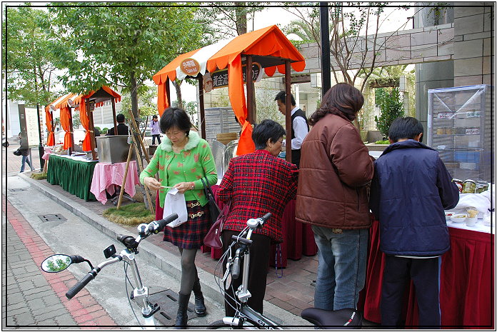 發現飯店側門旁有幾個攤位正在架設,還有一些人駐足圍觀,再定睛一看,