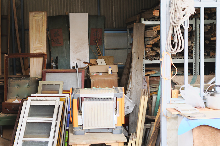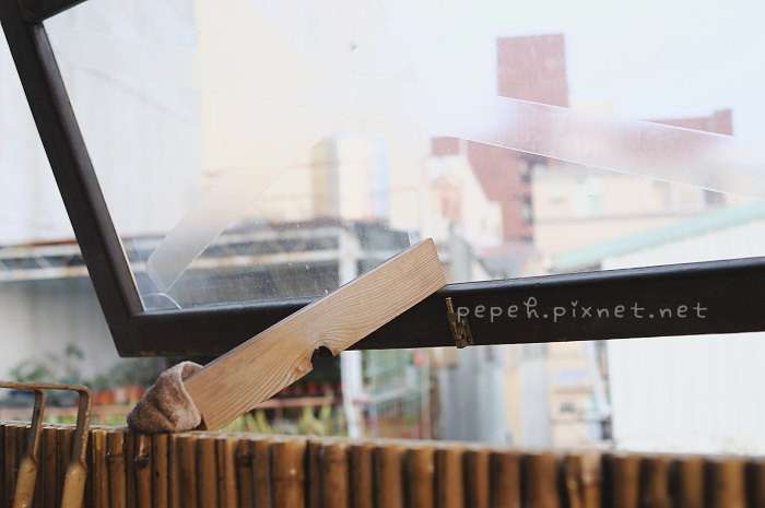 照片左上角像是水管的白色物體其實是排油煙機管,加上燈泡後,就變成晚上照亮木十八的燈具,真有巧思。