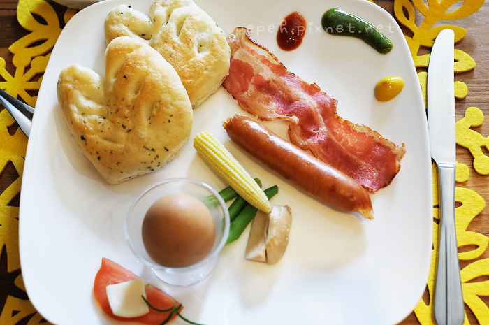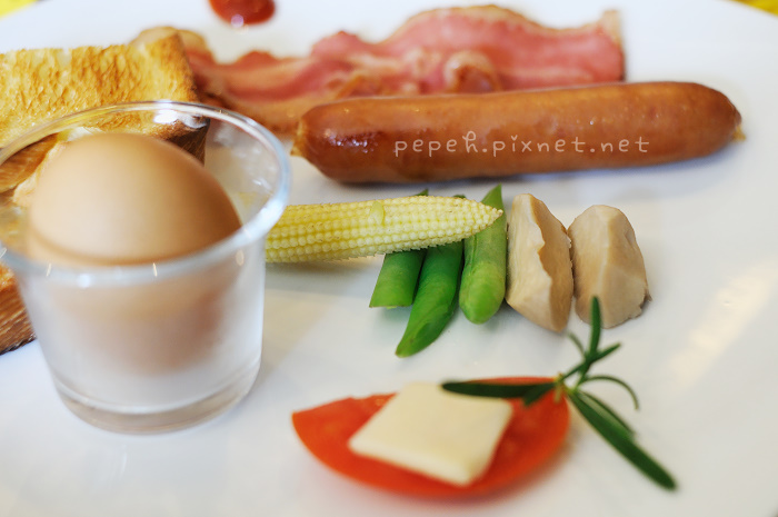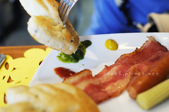丹麥吐司(另一份為佛卡夏)、香腸、培根、糖心蛋與季節時蔬的主食組合,友人最喜歡的是麵包沾上青醬的滋味。
