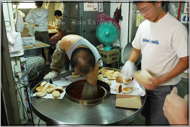 待我們吃完兩攤左營小吃,開車到第二公市場,正好是13:00出爐時間,只見老闆快手快腳的往烘爐裡拿出一個個燒餅,拍了兩張照片後,老闆搖手說:不能拍照唷!