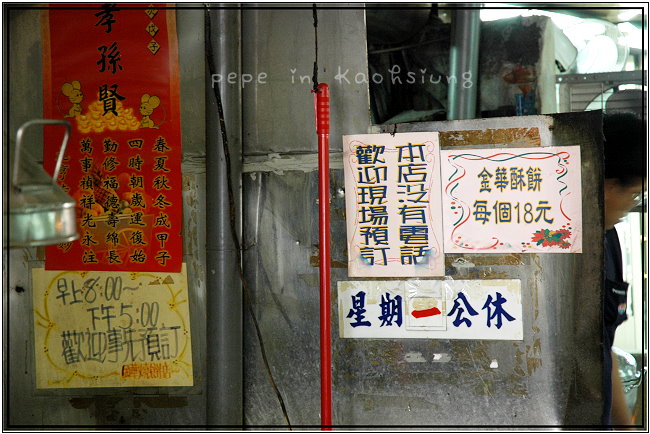 金華酥餅,是一年前在劉克襄先生為雜誌撰搞的文章中知道,卻一直沒能抽空前往,周末假日得了閒,正好要往左營覓食的路上,想起這家酥餅,便安排在午餐前前往。