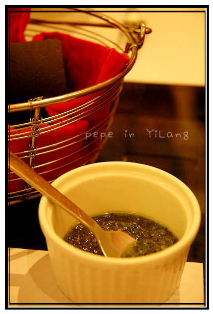 ●墨魚麵包,鬆軟香的墨魚麵包,沾取些自製青醬,香草風味帶些油光,口中頓時充滿蘿勒香氣。