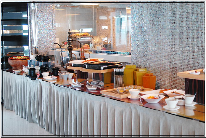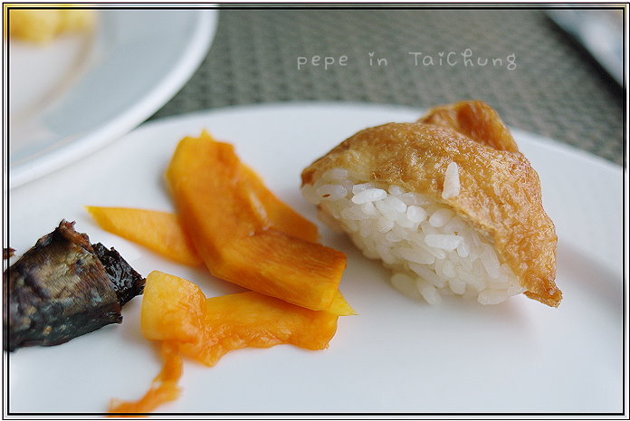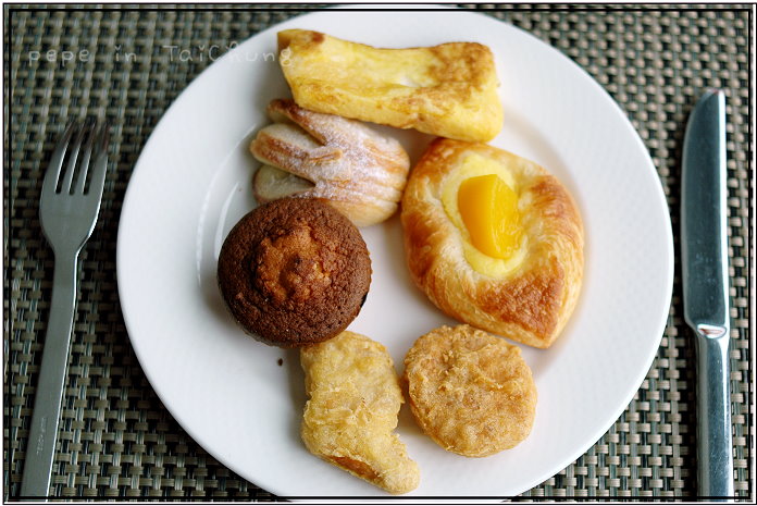 早餐是在28樓的異料理食用,是自助式的buffet,那天早上的人幸虧不多,不必排長隊伍等待夾食物,早餐含中、日和西式等,甫坐下,服務人員便到桌前詢問要茶還是咖啡,要了一杯茶和咖啡後,便起身去拿早餐,隨意的晃了一圈,被麵包區的燈光加上美味麵包吸引,一開始先吃了幾塊麵包,薯餅、雞塊、法式吐司也沒錯過,還拿了牛奶和優格回來,食物味道很不錯,拿第二輪時,w舀了些咖哩豬肉配白飯,我拿了豆皮壽司,再去麵包區拿了一塊法式洋蔥麵包。