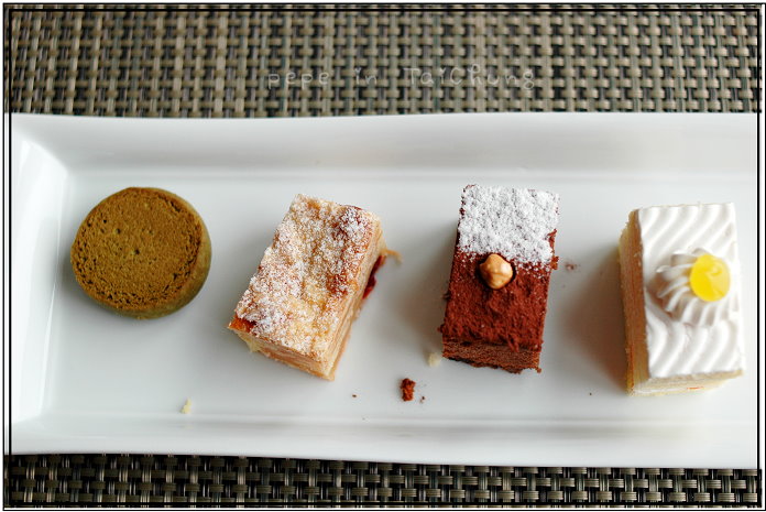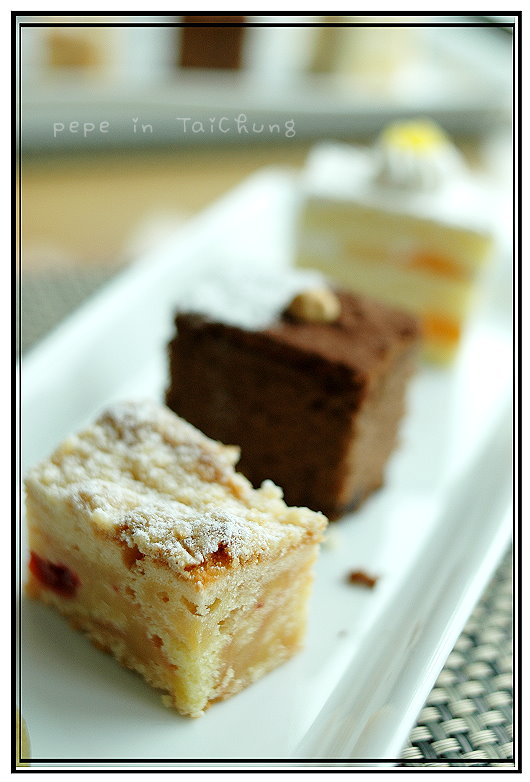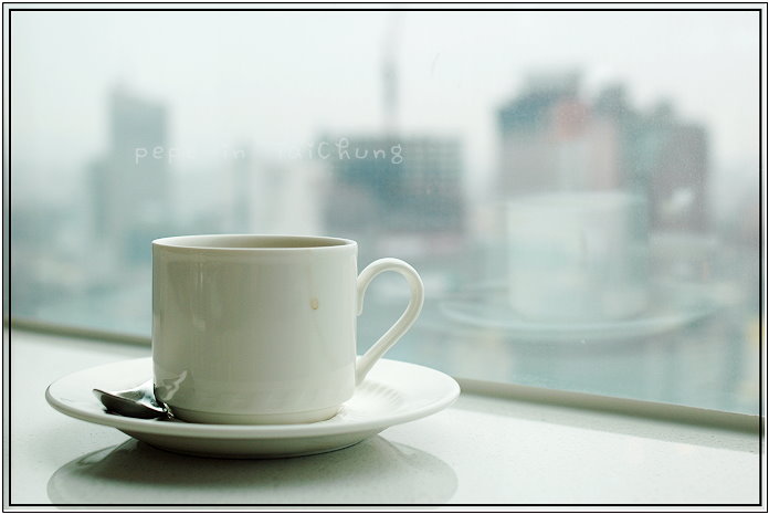 下午,我們拿著Hotel One送的下午茶券喝下午茶,以為是在一樓的麵包坊食用,沒想到還是在28樓的異料理,又坐在靠窗的位子享用美食,不是自助式的,是一人一份已配好的四塊蛋糕餅乾,再加上一杯咖啡或茶,咖啡和茶,就像水一樣,只要喝得快沒了,服務人員會詢問是否要加茶或咖啡,早餐亦然,蛋糕的味道並沒有想像中的好吃,也吃不出食物本身的質感…