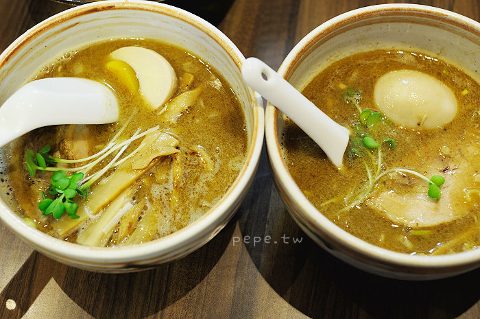 左邊是味玉沾麵的湯汁,右邊是特盛肉玉沾麵的湯汁。