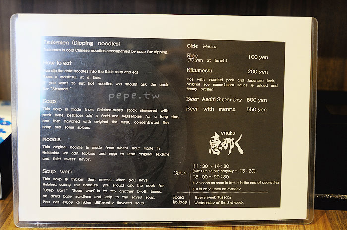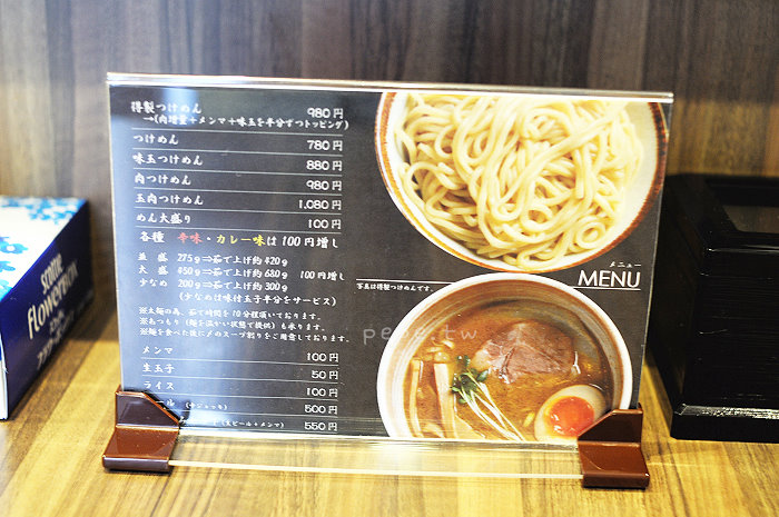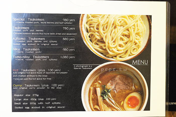 這家位於一乘寺一帶的沾麵店晚餐時間為6點營業,我們5點半就到了,從門口可見店家準備的燈亮著,準時6點開門營業,先入內到食券機買食券,肚子很餓的我們,選了特盛玉肉沾麵1080円和味玉沾麵880円,女店員負責烤叉燒肉,叉燒肉稍有厚度,但咬下去的口感好柔嫩,一咬即裂,原本不愛吃叉燒肉的我也一吃上癮,老闆負責麵條,坐在吧台前清楚看到沾麵麵條的煮法,比起拉麵,感覺煮沾麵更是費工費時,挾起有彈性與嚼勁的麵條,沾上魚介雞豚沾麵湯汁,像是湯麵又像乾麵的滋味,依照個人喜好而選擇沾醬多寡,麵條吃完後,親切帥氣的老闆主動幫我們把沾麵湯汁碗拿去加湯,便可直接喝湯,沾麵的雙重食感真是太有趣了,還有,老闆雖忙著煮麵,卻時時注意客人的動態,讓非日本人的我們也倍感受照顧,惠那く親切與美味讓我們愛上吃沾麵,若是推薦京都沾麵,這家肯定在自己吃過的前三名名單中。