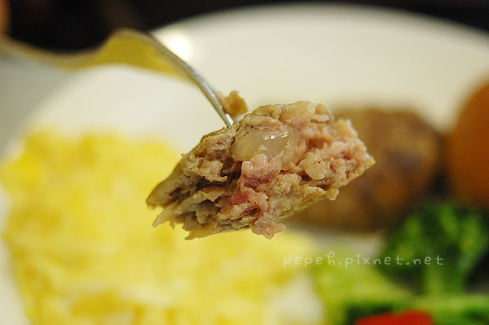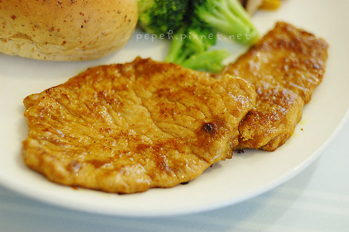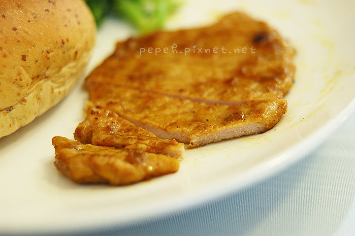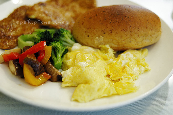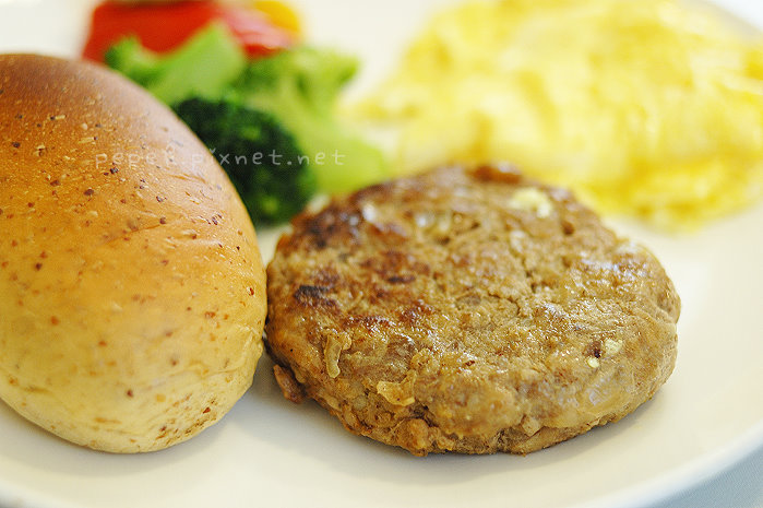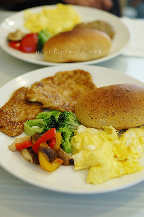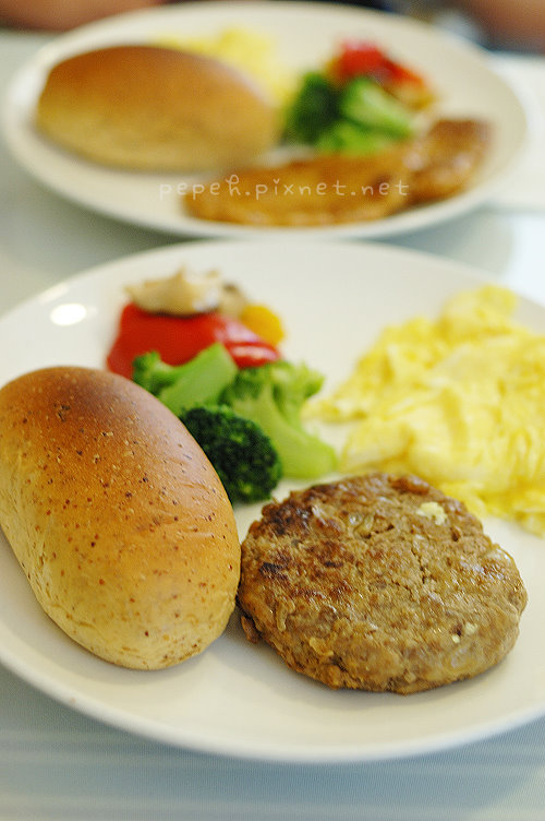 主食上桌,除了甜椒炒花椰菇類的配菜,還有炒蛋、麵包和豬排 (或漢堡),炒蛋好香嫩,份量也多,麵包烤的好香,w吃完自己的麵包,也不客氣的吃了我一大半的麵包,直稱讚好吃,香煎豬排是我們最推薦的主食,豬排嫩,用刀子輕輕一切就可以輕鬆切分,我愛這個味道。