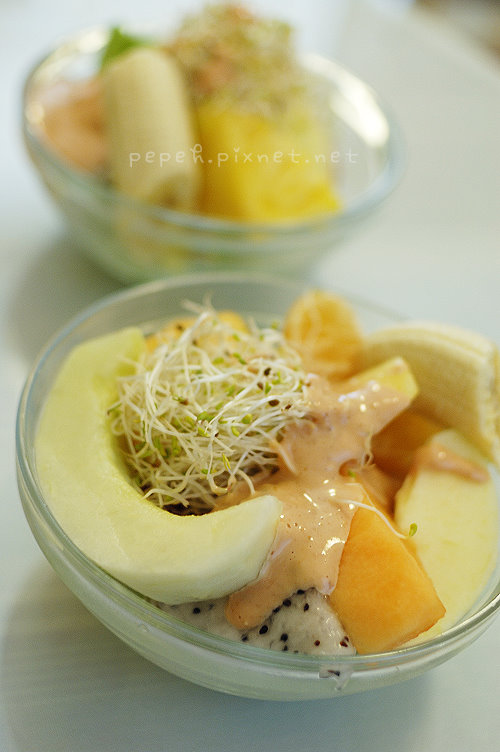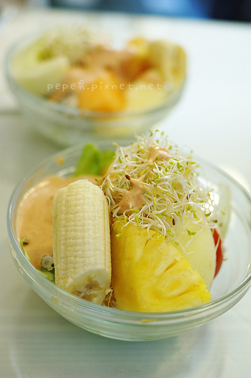 水果沙拉,一點也不小氣的擺上各式水果切片,有香蕉、鳳梨、蘋果、柳橙、西瓜、香瓜、火龍果、小蕃茄和生菜,搭配的沙拉醬並非美乃滋,感覺像是優格醬,是我很愛的沙拉醬汁,豐富的水果真叫人印象深刻。