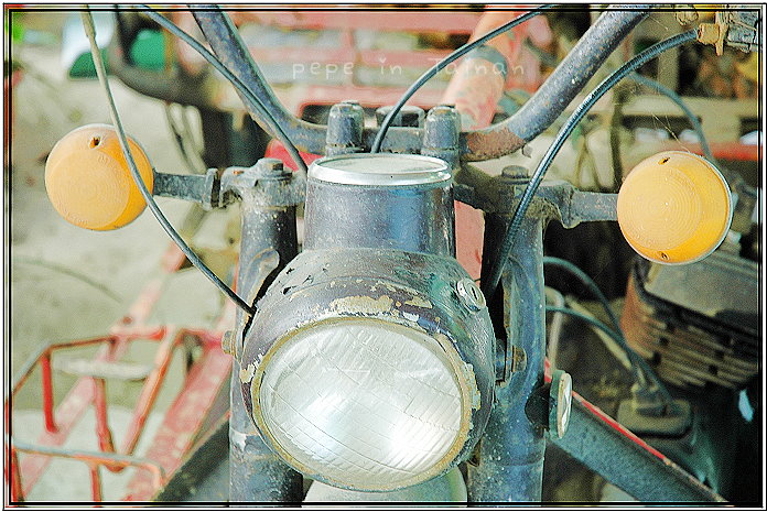 再往辦公室右後方的植栽區探尋,一輛載滿落葉的車子吸引我們的目光,外型好帥,