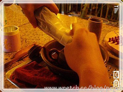 煮開熱水後,再倒入小茶壼中,這個動作叫做”溫壼”。