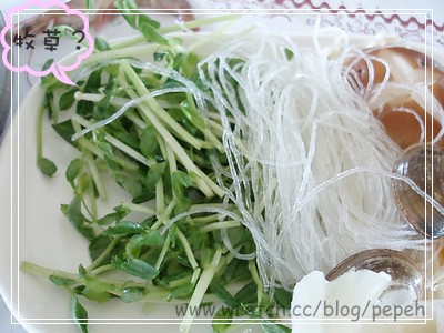 等我把所有海鮮料全部丟到鍋裡後,赫然發現一堆牧草–苜蓿芽,出現了牧場的感覺了..哈..^^