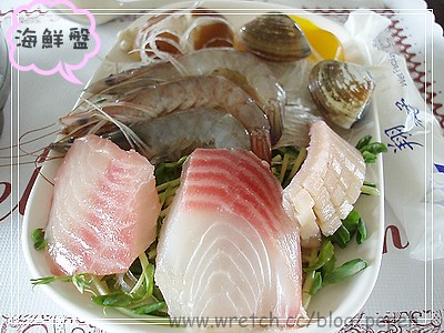 海鮮盤,兩塊魚、蛤蜊、三隻蝦、一塊魷魚、冬粉和苜蓿芽,和其他餐廳的海鮮火鍋相比,這樣的價位附上這樣的海鮮料,還是有點小貴。