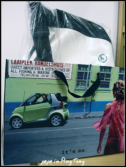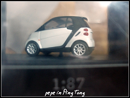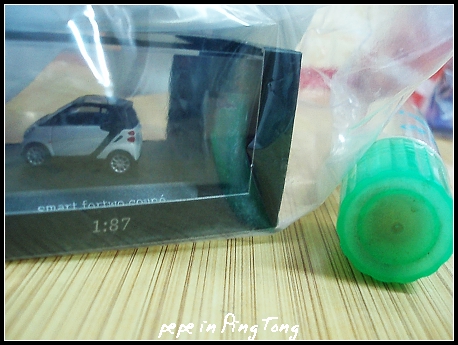 他抽到的1:87的smart小模型車一輛,很可愛。