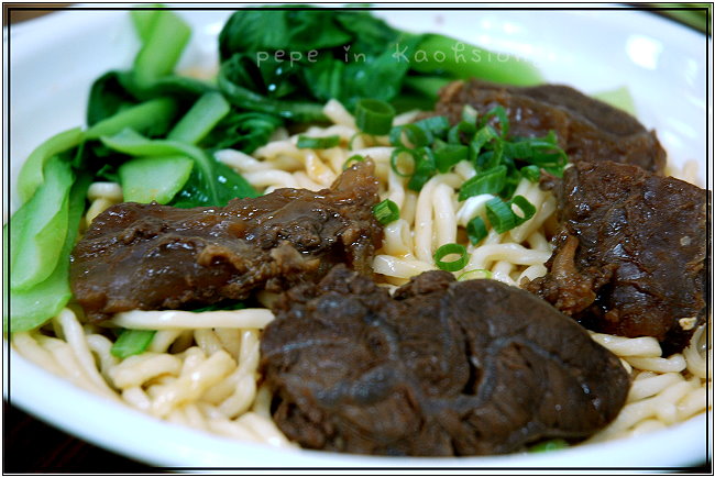 ●牛肉拌麵,80元。四塊牛肉鋪在麵上,放上一把青江菜,拌著麵,味道據說也還不錯。