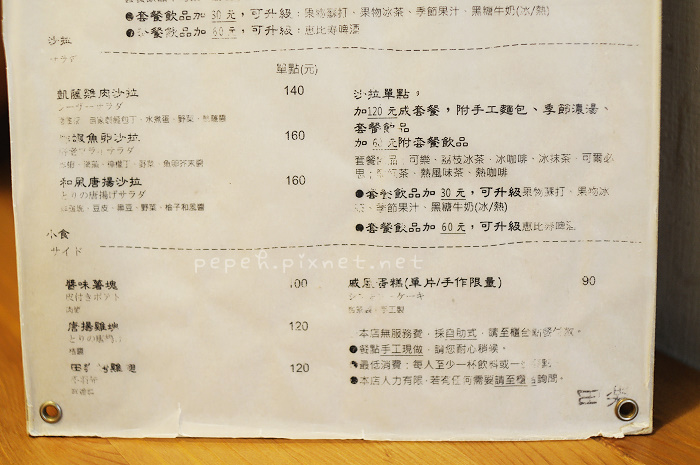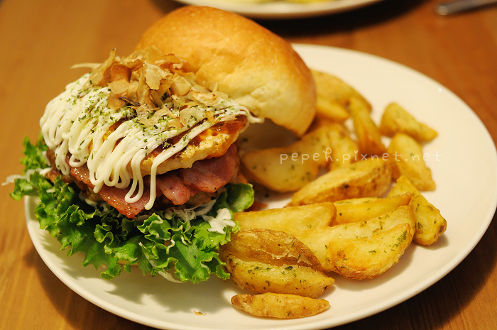 臨時決定的台中一日小旅行,最期待的其實是晚上的田樂漢堡,白天不敢吃太飽,怕晚上吃不下,這回很節制的各點了一個漢堡,單點均附薯塊,一份加60元點飲料、一份加120元做套餐,套餐內容有田樂小沙拉、季節濃湯和套餐飲品,上回來田樂時,覺得應該要點可樂配漢堡才對味,這回來無論如何都要點可樂配漢堡,另外一杯飲料則選了可爾必思,另外再單點一份唐揚雞塊,蔥烤豚燒堡依舊很美味,是我們一直很喜歡的滋味;廣島燒肉堡(辛)是我們點的另一份漢堡,mei笑說她也覺得我們一定會點廣島燒肉堡,雖然上頭註明這是辛口味的漢堡,但我們並不覺得很辣,厚煎玉子所用的醬汁特別從日本進口,手打豬肉漢堡排口感厚實,兩者一起吃果真有驚喜的味道,唯一讓我苦惱的是如何優雅吃廣島燒肉堡,最後是拿著刀叉把漢堡玉子培根燒肉切分成好幾份,再用手拿取夾食,不然實在很難大口咬下那堆疊起來的餐食。