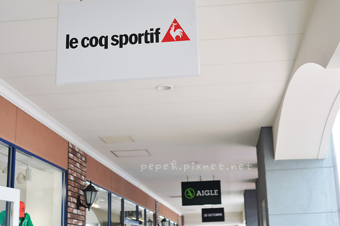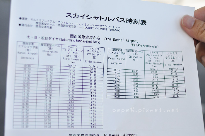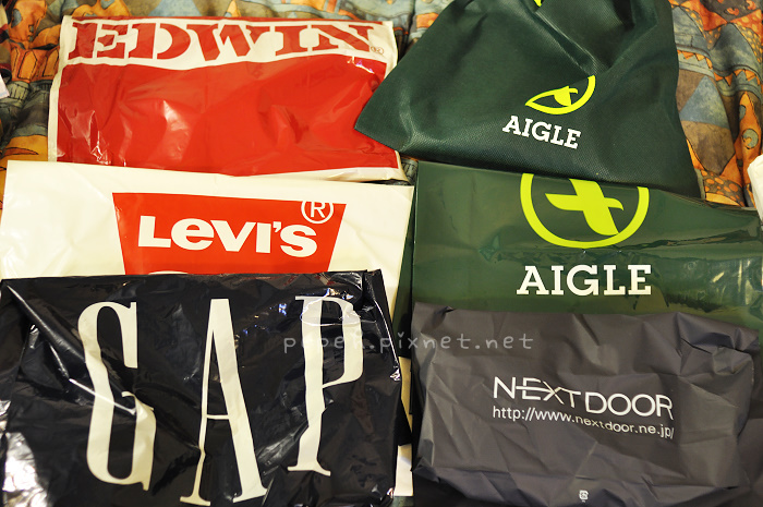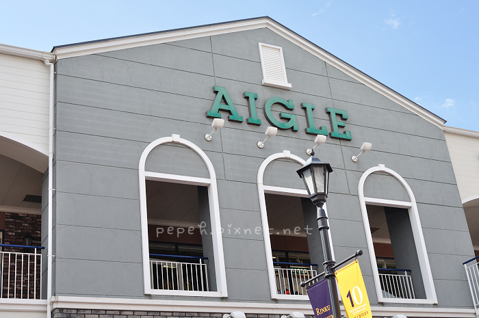 接駁車的地點在出機場後對面的建築物-Aero Plaza,感謝Aero Plaza一樓飯店的工作人員提供我們一張接駁車的時刻表,接駁車的站牌就在Lawson旁,搭乘一回為每人100円,中間會停3站,約25分鐘後到達Rinku Premium outlet,平日的班車車次較少,要稍微注意一下時刻表的來回時間,outlet約有150多家,規模相當大,原本以為多為名牌店,實際逛了才知道也有一些平日就想買的牌子,因為晚上要搭haruka到京都,我們沒有一家一家逛,而是挑自己想逛的店家,最愛的是AIGLE,平日想買都買不下手,在這裡買可以狂買,在outlet的商品價格已經比外面便宜許多,還有折扣優惠,買二項商品再打9折、四項商品再打8折,當然要買4項以上的商品才划算,買了四件衣服打完折下來花了13104円,裡面的女服務員雖然行動不便,但細心的包好後,仍堅持一拐一拐的走到門口,恭敬的把商品拿給我們,服務真的很好。