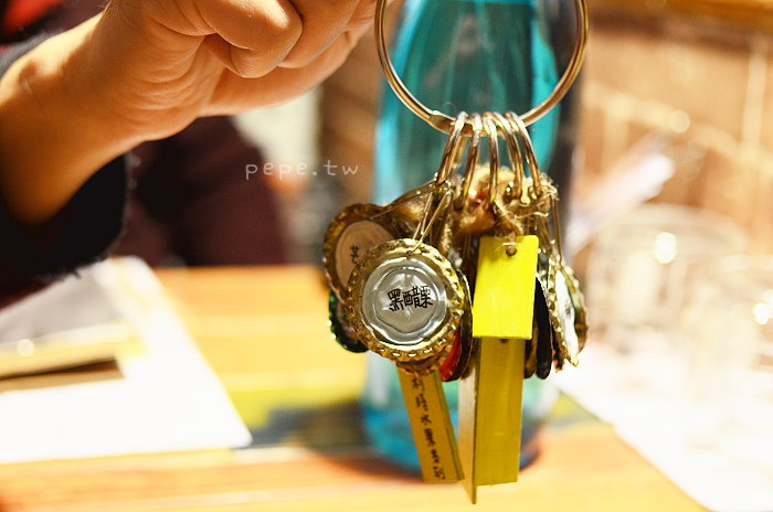 另一個趣味是有酒精的飲料,把許多酒的瓶蓋寫上口味串成一串,鈴鈴鐺鐺的聲馨彷彿正要拿鑰匙打開那個不知名空間,空間有趣,餐點美味,這個奇幻迷人的地方真教人印象深刻。