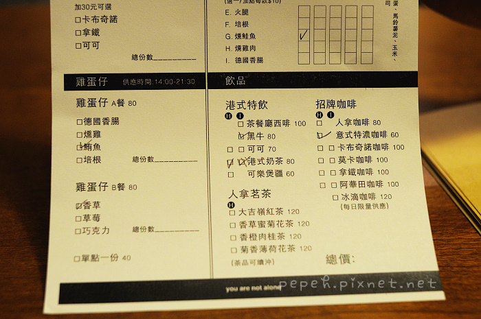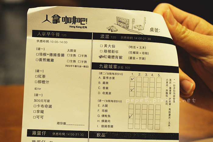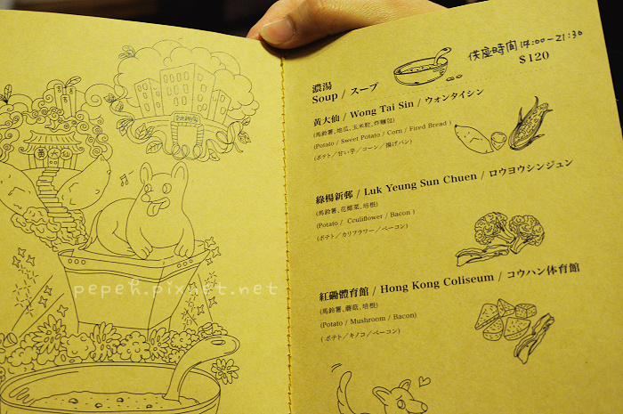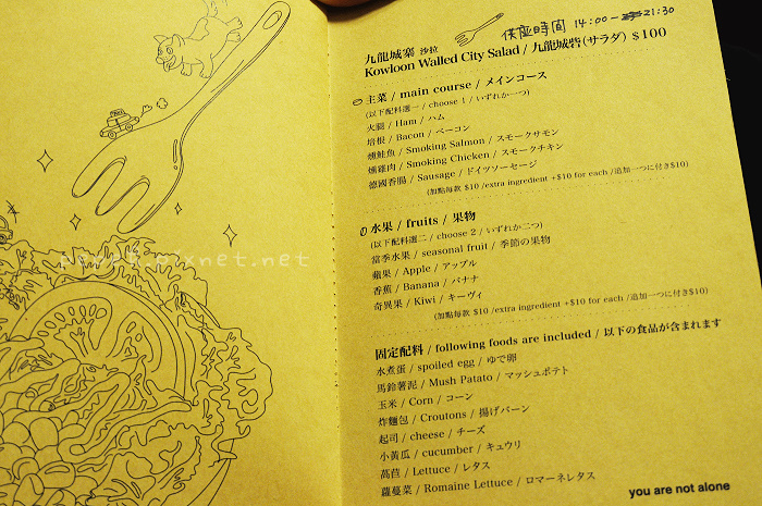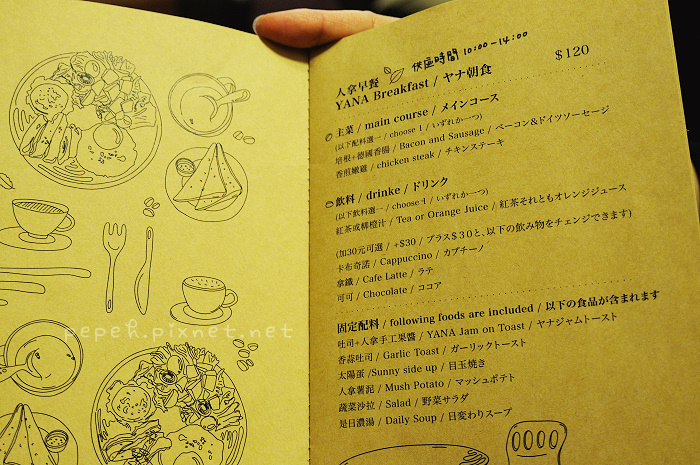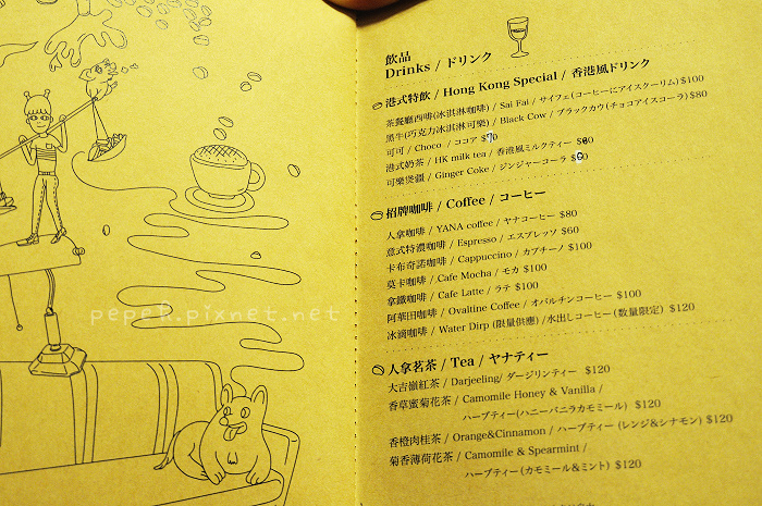 英文名YANA,為 You Are Not Alone的英文縮寫,華文名”人拿”,則是取咖啡”由人拿”之意(冏),空間裡流洩的是時而輕柔、時而奔放的粵語音樂,餐點自然也放進香港地名與點心特色,濃湯以香港地名命名、夜市常見的雞蛋仔則為特色點心、早午餐的價格也親切的不像話,菜單中的插圖設計也讓人好喜歡,巧克力冰淇淋可樂-黑牛則是充滿微妙口感的滋味。