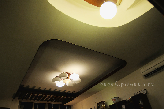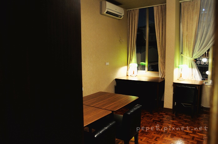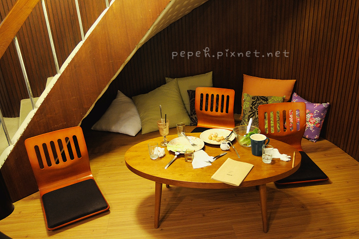 像是拜訪朋友家般,脫好鞋、拿拖鞋,先映入眼簾的是客廳座位,櫃台廚房還要再往前走,就如同自家的空間配置,與其他店家一進門就看得到吧台的設計有明顯的不同,老空間原本的裝潢就很迷人,迴旋樓梯包上地毯面與床面,往上或走下都像是走樓梯伸展台,坐在樓梯下方的空間可坐可臥,也不會感覺到侷促,桌上的綠色銀行燈一直都是自己喜歡的燈具,燈具、樓梯、甚至廚房多是原本的陳設,店家租下後僅多了櫃子、地板和一些佈置,不刻意營造,只是保持原本的老味道,再加入一些店家個人的特色,這樣剛好。