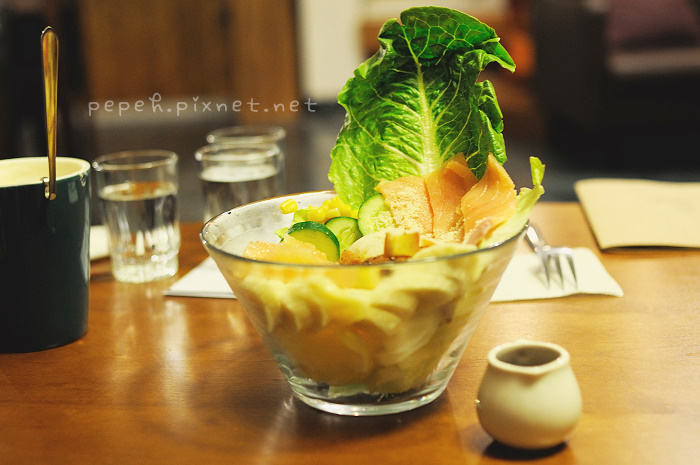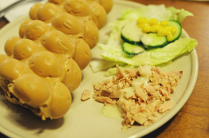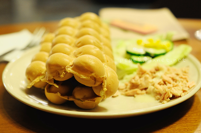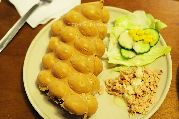 還記得第一次買雞蛋仔是在嘉義的文化夜市,那時是邊剝邊吃,這回不想沾手的我們,試圖用刀叉優雅食,但仍吃的手忙腳亂,這兒的雞蛋仔外皮酥、內有點軟溼,加上冰淇淋即成甜味雞蛋仔,選了鮪魚沙拉即是鹹味雞蛋仔,與好友一起分食著這特別的點心,增了滋味也多了趣味。讓自己印象深刻的還有沙拉填單的選擇,好友選了九龍城寨沙拉,水果任選二、鹹食任選一,依據個人口味的客製化沙拉,味道佳,也讓人感受到那份貼心。