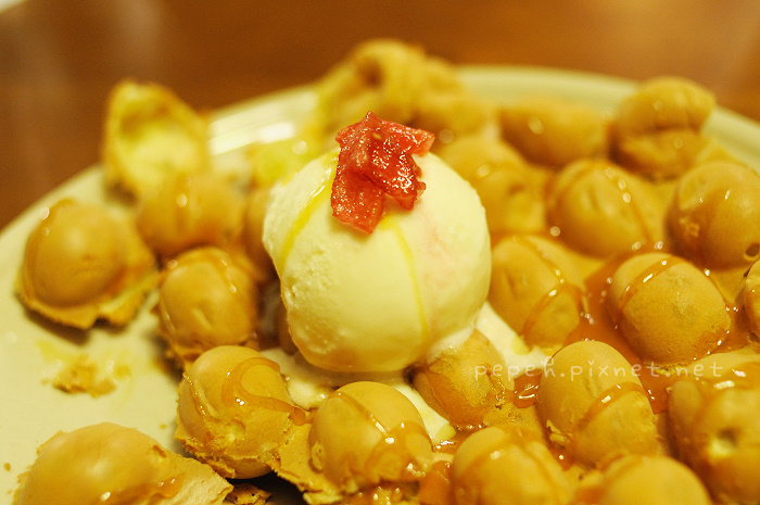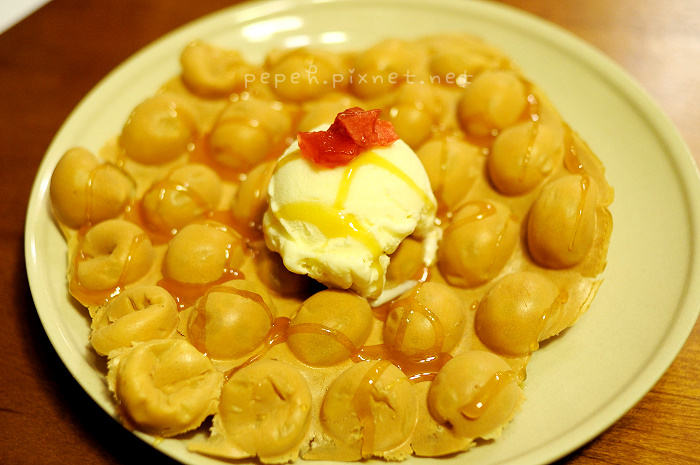 雞蛋仔B餐,80元,有三種甜口味可選,我們選的是香草口味,是雞蛋仔加一球香草冰淇淋,冰淇淋上放了自己做的果醬。