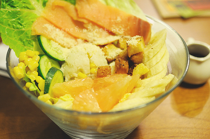 九龍城寨沙拉,100元,好友選的是當季水果、香蕉和燻鮭魚的組合。