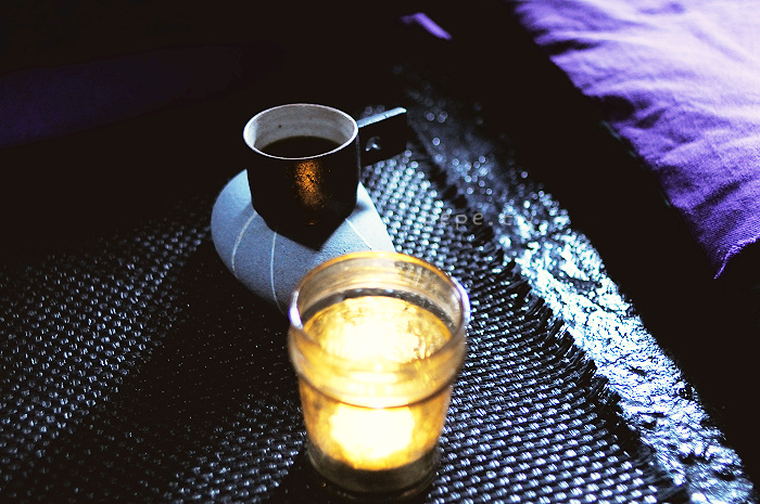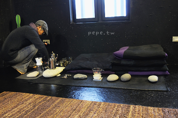 那天天氣陰,我們的咖啡儀式地點在公共空間旁的一角,席地而坐,先聞豆子的乾香氣,自己手磨咖啡豆,李小姐再幫我們手沖咖啡,聞杯底與咖啡的溼香氣,再啜飲入喉,第一支喝的是哥斯大黎加的咖啡豆,淺焙,有梅子香氣;第二支喝的是印尼日晒瓦哈那,風味獨特。