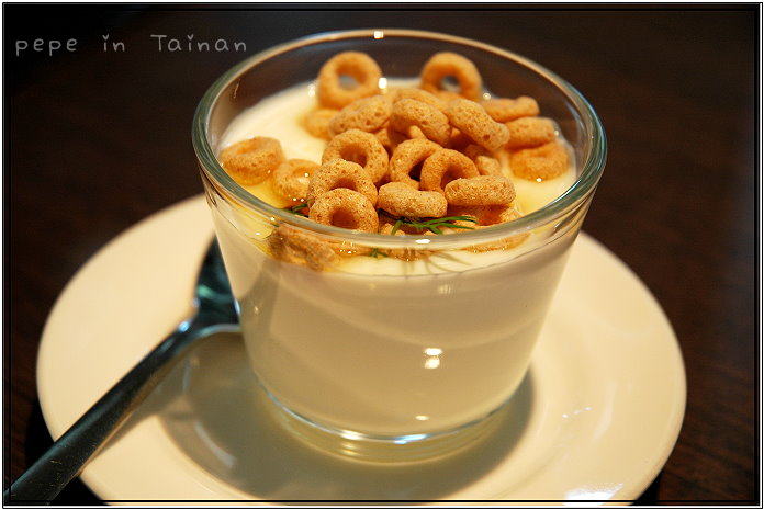 ●甜點選的是穀乾優格(?),自製優格上方放了不少微甜的玉米脆片,優格是帶點酸的,脆片是甜的,