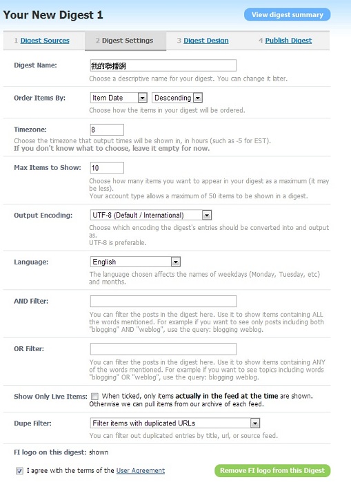 5.digest settings 設定部分,我只有改timezone為”8″,dupe filter:選”filter items with duplicated URLs”,避免同一篇文章因修改而重複出現在聯播網中。