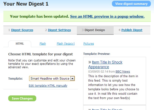 6.下一個標籤”digest design”,外觀設計,template我選”smart headline with source”,按下”save changes”。
